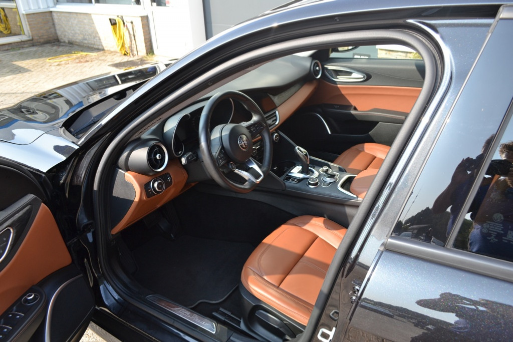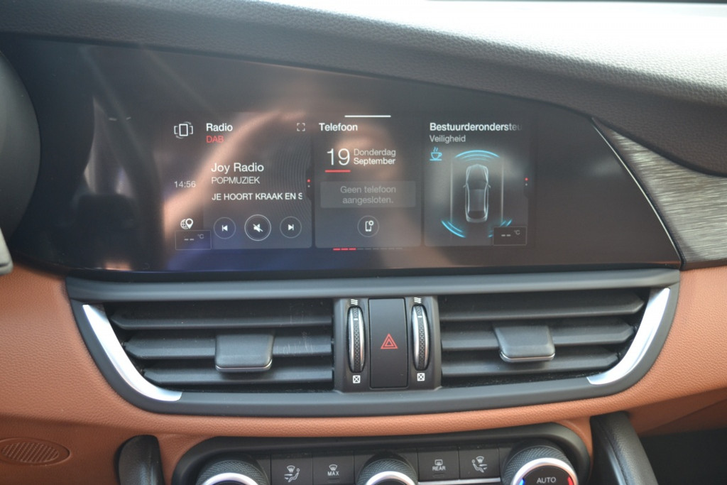 Tijdens de rit wordt u als bestuurder ondersteund door verschillende systemen die de weg en uw omgeving in de gaten houden. Een belangrijke bijdrage aan de veiligheid onderweg levert de verkeersbord-detectie in deze Alfa Romeo. Het Lane-keeping systeem zorgt dat u mooi binnen de lijntjes blijft. Ongemerkt buiten de rijstrook komen is er niet meer bij. Ook als uw aandacht even verslapt, blijft de forward collision warning bij de wekker. Dreigt er een botsing met een voor- of tegenligger, dan waarschuwt het systeem direct. U bent mede dankzij dodehoekdetector, hill hold functie, Abs - anti blokkeer systeem met brake assistant, vermoeidheidsherkenning en bandenspanningcontrolesysteem steeds veilig onderweg.