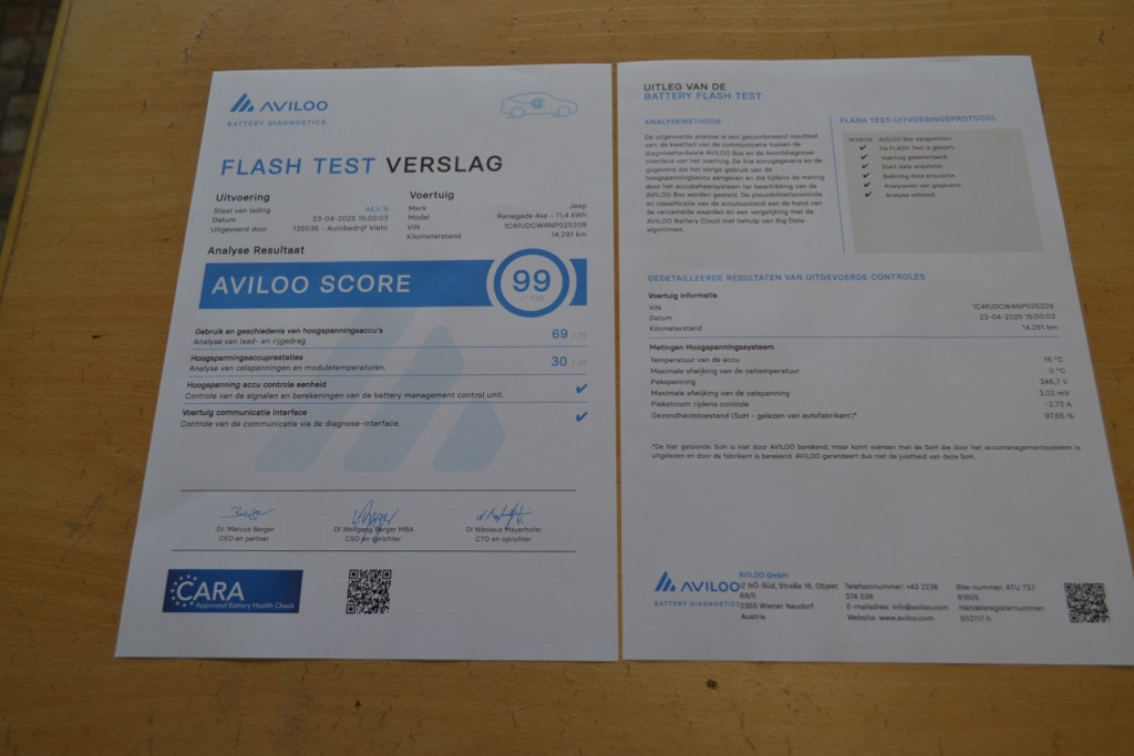 Het accupakket is officieel gecontroleerd met de Aviloo en is nog voor 99% goed. Zie het rapport.